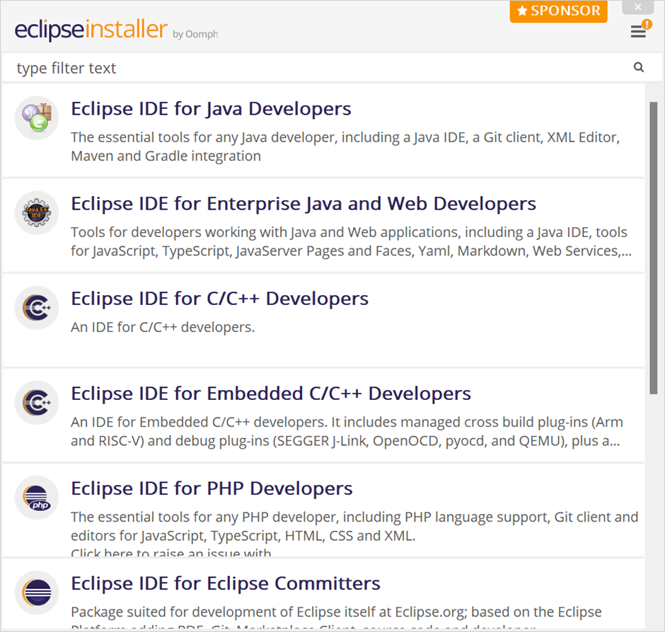그림처럼 이클립스 인스트롤러 화면이 나오는데 맨 위에 두 개 아무거나 선택하셔도 상관없습니다만, 저희는 맨 위에서 두번째 있는 Eclipse IDE for Enterprise Java and Web Developers로 다운받도록 하겠습니다. 이 두개의 차이점은 웹개발 관련 기능이 있고, 없고 차이라서 지금은 상관없습니다만, 나중에 웹개발까지 목표로 세우셨으면 두 번째로 선택하시면 됩니다.