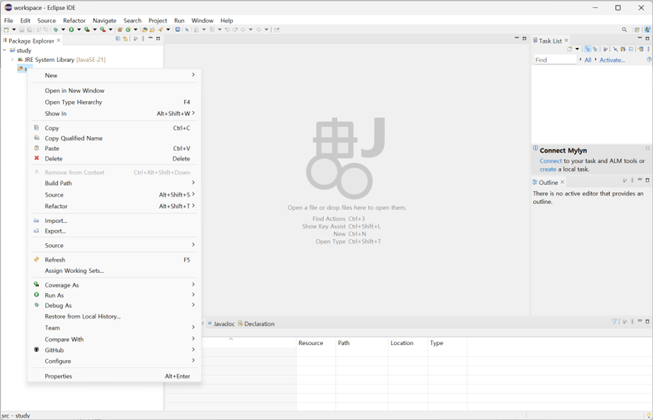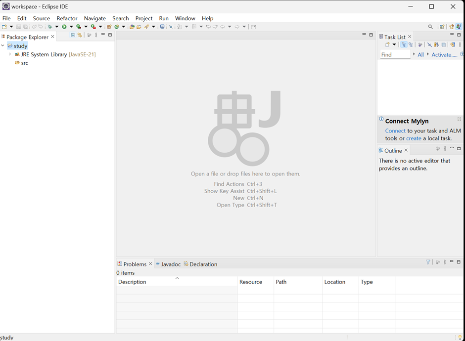 그럼 위 화면과 같이 최종적으로 study라는 프로젝트가 생성되었고, 옆에 > 아이콘을 클릭하면 하위에 JRE System Library와 src가 나오면 정상적으로 생성된 것입니다