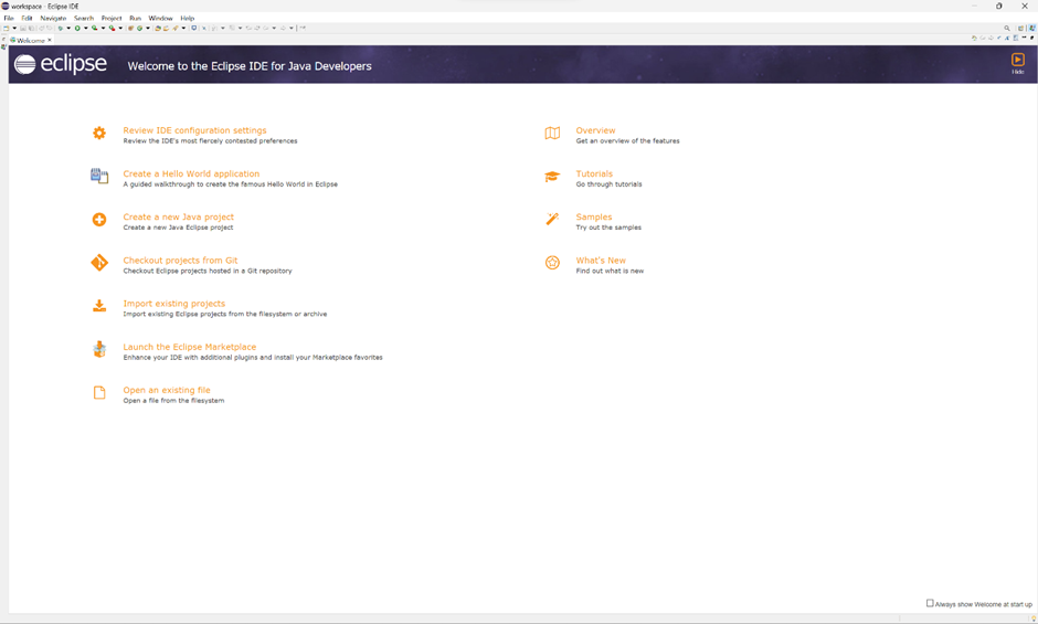 잠시 기다리면 eclipse가 실행되고 위와 같이 화면이 나오게 됩니다, 중요한 내용은 아니니 지금은 위쪽 탭에 Welcome을 닫습니다. (x 누르시면 됩니다.)