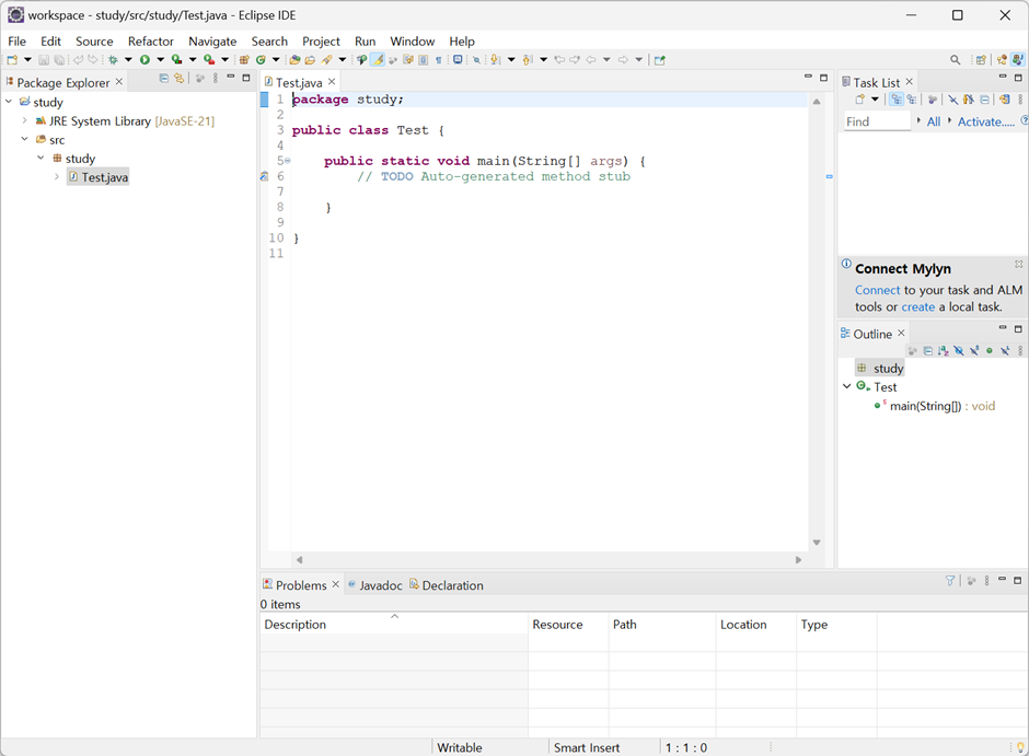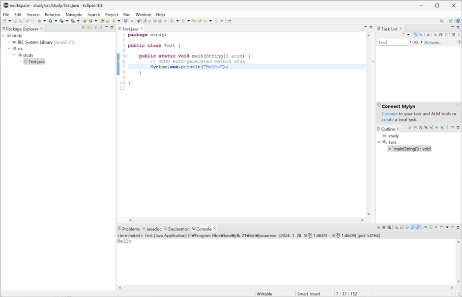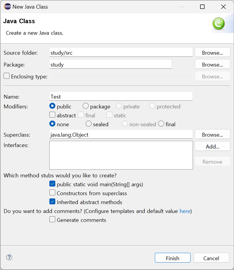 이 창에서 위 그림처럼 Name은 Test라고, 아래쪽에 public static void main(String[] args) 이부분을 체크하고 Finish 버튼을 누릅니다. (지금도 역시 자세한 건 뒤에서 배우니 눈으로만 보고 넘어가셔도 됩니다.)