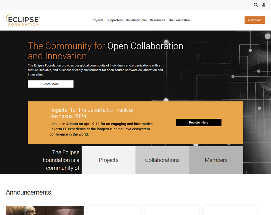 이클립스 역시 오픈소스이므로 사용제약 없이 사용할 수 있습니다. 이클립스 공식 홈페이지(http://eclipse.org)에 접속해 보겠습니다.