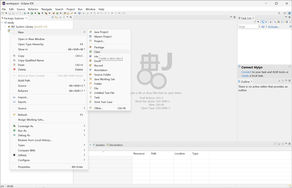이제 이클립스 설치와 프로젝트 생성까지 다 되었으니, 첫 자바 파일을 만들어 보도록 하겠습니다. 자바는 하나의 파일을 하나의 클래스 단위로 생성합니다. 나중에는 하나의 파일안에 여러 클래스가 존재하는 경우도 있지만, 대부분은 하나의 파일이 하나의 클래스로 만들어지는 경우가 많으니 일단 지금도 하나의 파일(클래스)로 생성해 보도록 하겠습니다.