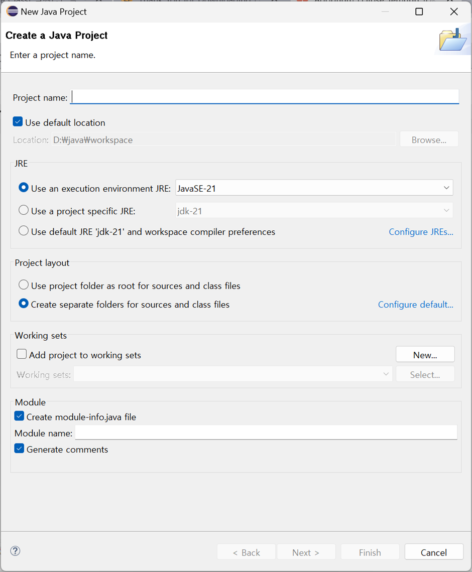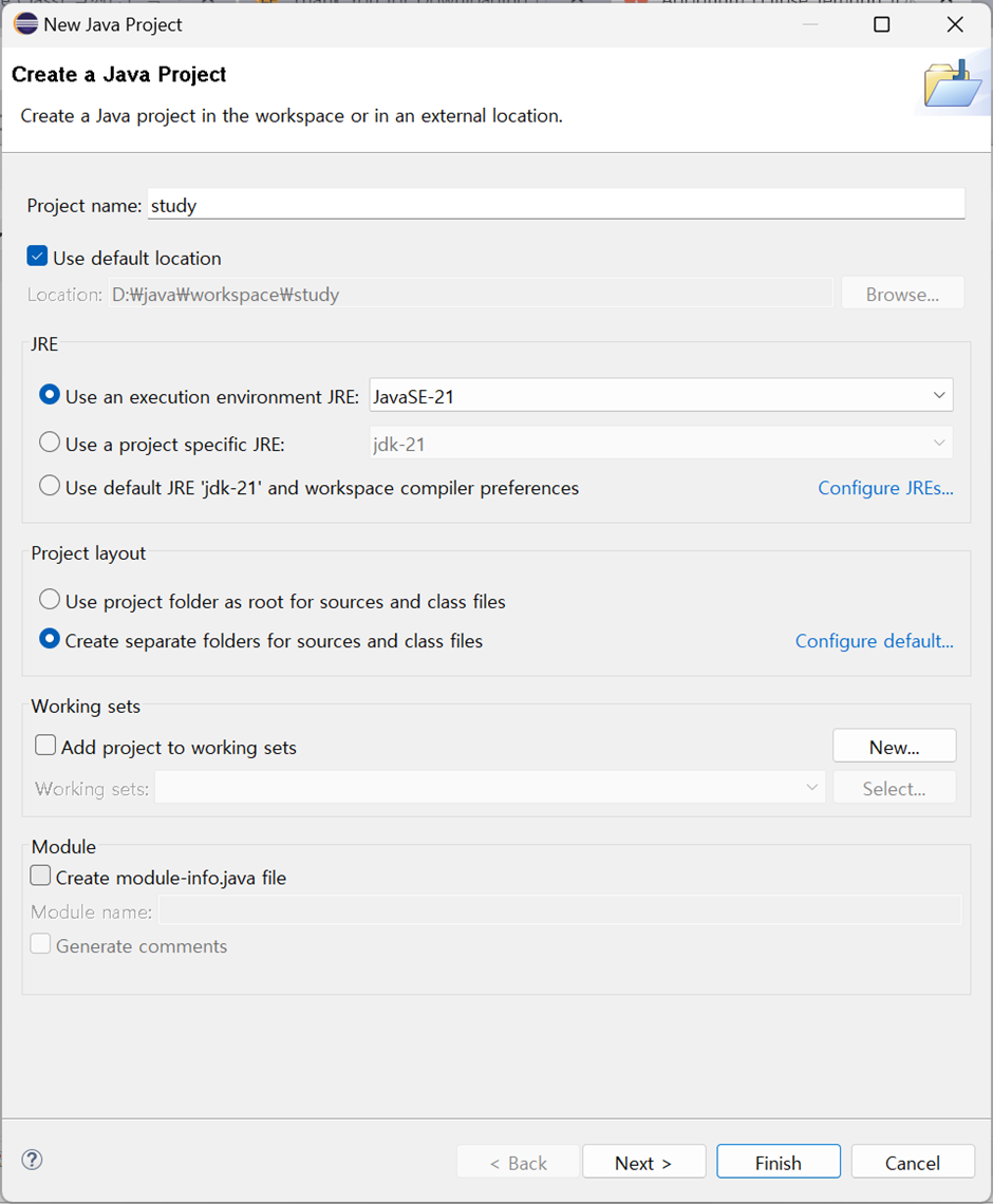 Create Java Project 창에서 지금 수정할 부분은 맨 위의 Project name은 프로젝트명 입력하시고, 맨 아래 Create module-info java file은 체크해제 하겠습니다. 지금 이것들이 무엇인지 잘 몰라도 상관없고, 프로젝트명을 입력하는 곳이구나 정도만 아시면 됩니다. 나머지는 시간이 지나면 자연스럽게 알게 될 것들입니다.