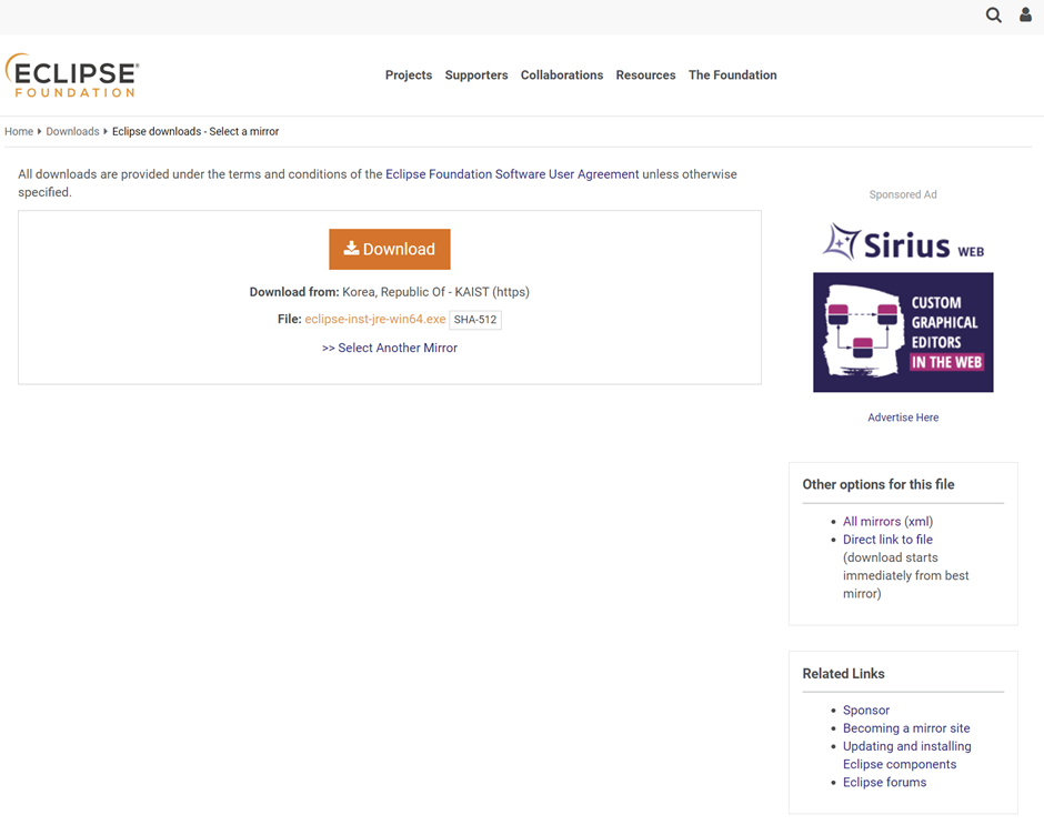 첫 페이지에서 다운로드 버튼을 클릭하면 이클립스 현재 운영체제에 맞는 실행파일을 다운로드 받을 수 있습니다.