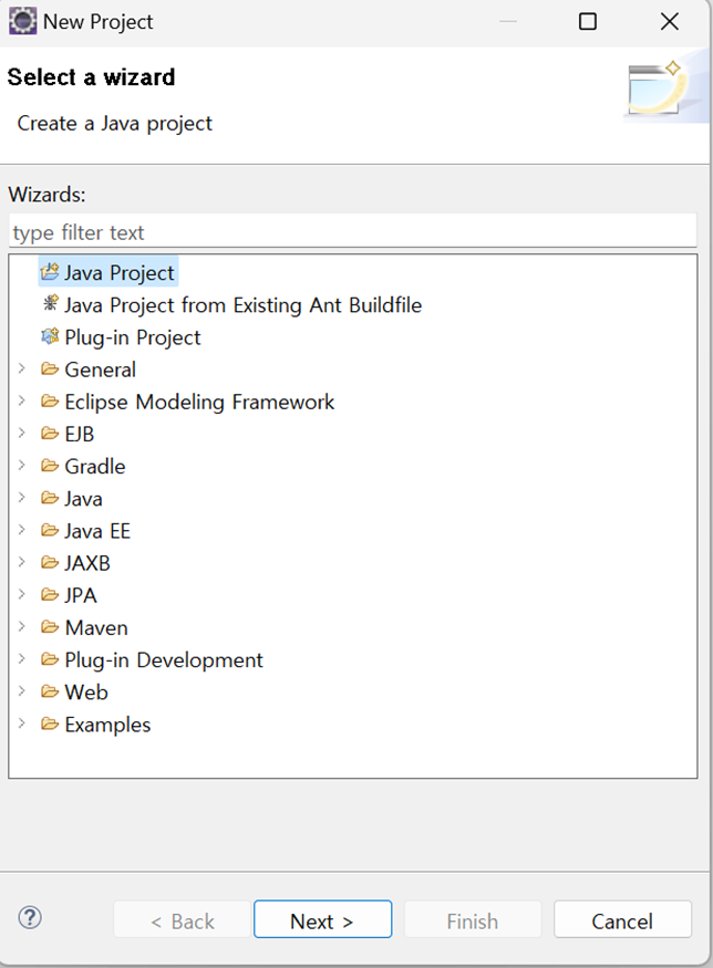 프로젝트 생성 창에서 상단에 있는 Java Project를 선택하고 Next 버튼을 누릅니다.