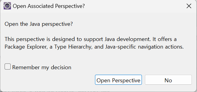 퍼스펙티브는 eclipse의 UI 종류라고 생각하시면 됩니다. Java perspective는 자바 개발에 맞는 이클립스 UI가 되겠네요. Open Perspective버튼을 누릅니다.