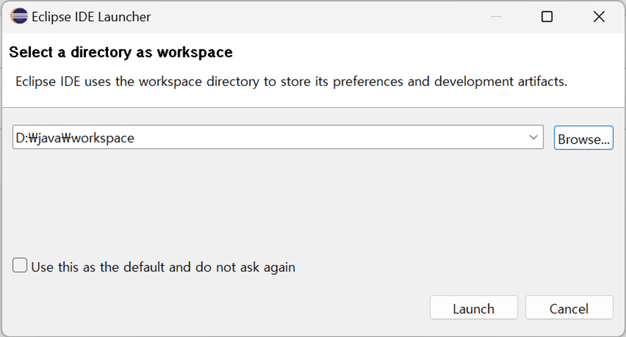 이 창은 workspace를 선택하는 화면인데요, 우리말로 작업공간이라고 생각하시면 됩니다. 저는 D드라이브에 java라는 폴더를 만들어 놨기 때문에 그 안에 workspace라는 폴더를 만들어서 지정하도록 하겠습니다. 이 부분도 여러분이 원하는 경로로 작성하시면 됩니다. 이왕이면 여러분이 나중에 찾기 쉽고 관리하기 쉽게 폴더 구조를 정하시는 것이 좋겠죠? 저는 D 드라이의 java 폴더 안에 eclipse도 workspace도 같이 존재하도록 구성했습니다.