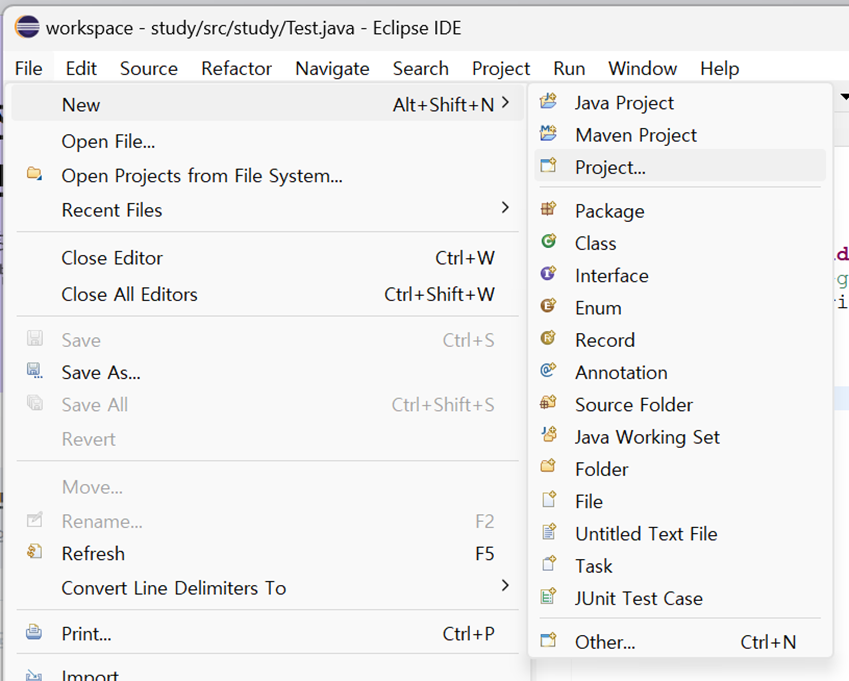 그럼 이제 첫 프로젝트를 만들어 볼 건데요,이클립스 실행화면에서 상단 메뉴 중에 File > New > Project를 선택합니다.