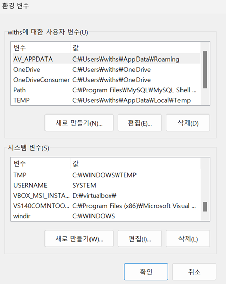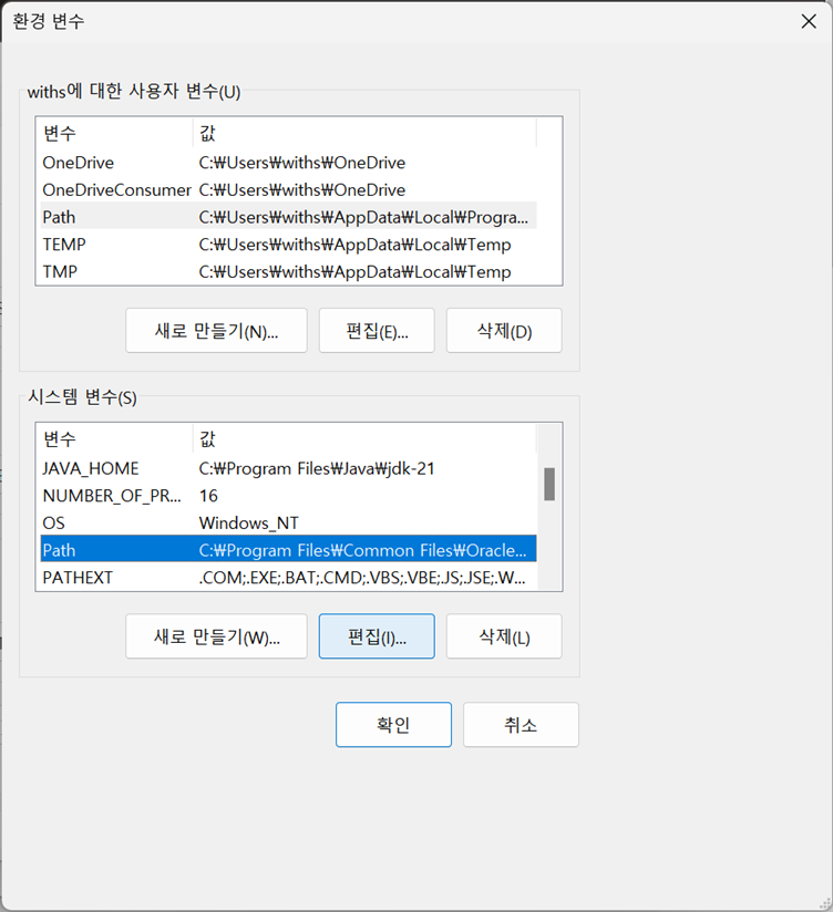 이제 Path라는 변수를 수정해야 합니다. 변수를 클릭해서 선택한 후 편집 버튼을 누릅니다.