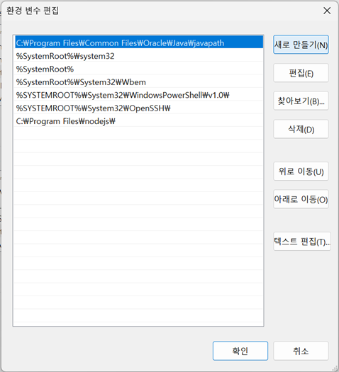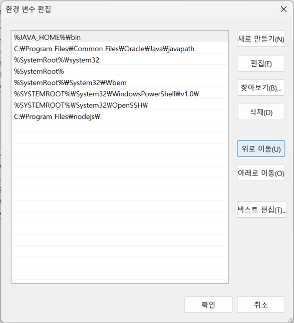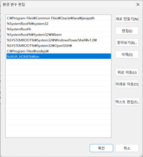 %JAVA_HOME%bin을 입력한 후 확인버튼을 클릭합니다.