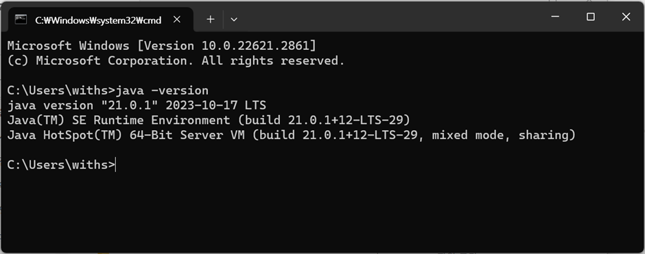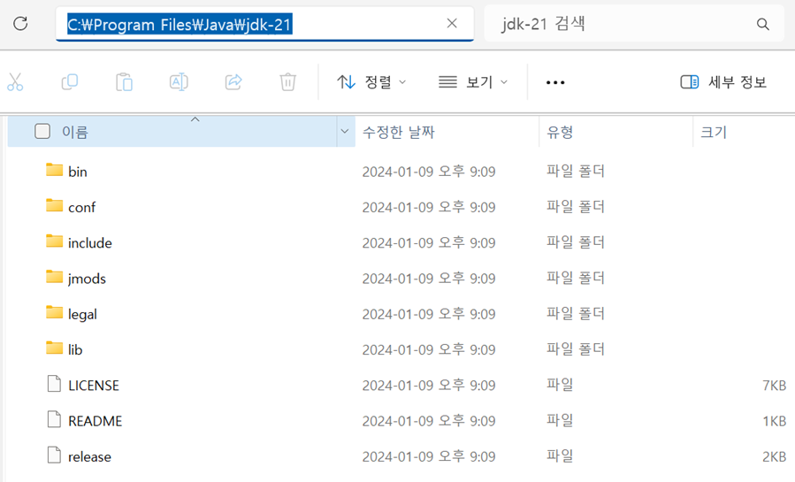 java version “21.0.1”... 이라고 출력된다면 정상적으로 설치와 설정까지 완료된것입니다.