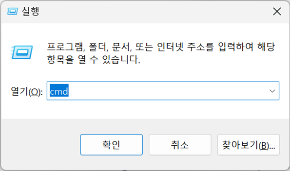 명령 프롬프트 창을 실행하겠습니다. 실행하는 방법은 윈도우 프로그램에서 직접 실행하셔도 되고, 단축키로 윈도우키와 R 버튼을 동시에 누릅니다.