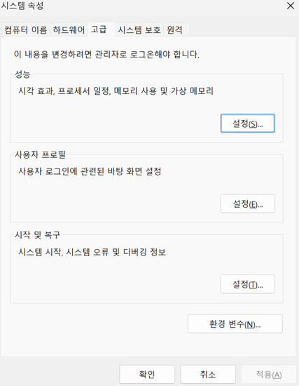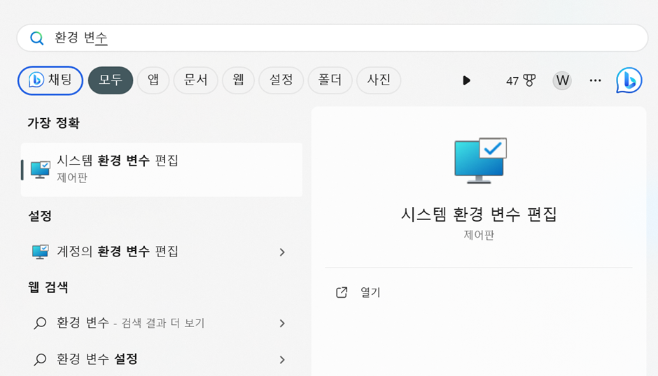 환경 변수를 설정할 수 있는 위치로 가야하는데, 여러 방법이 존재합니다. 윈도우메뉴로 접근해도 되고, 제어판으로 접근해도 되는데, 윈도우7, 10, 11 OS마다 경로가 다르므로 가장 편한 방법은 윈도우 검색으로 접근하는 방법입니다.