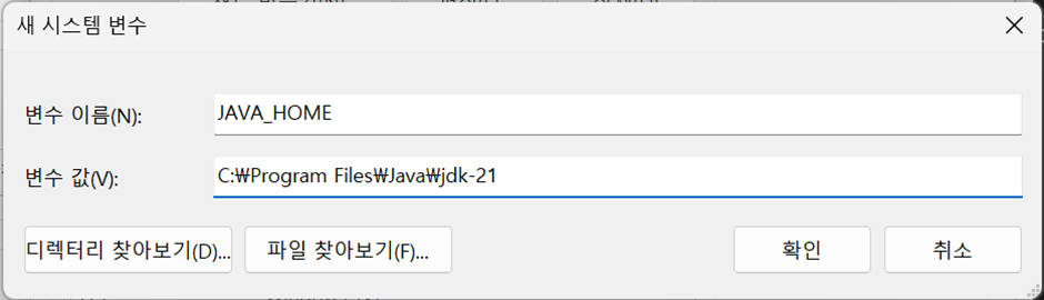 변수 이름은 JAVA_HOME이라고, 변수 값은 JDK가 설치된 경로를 넣습니다. 경로를 모르겠으면 JDK 설치 시 경로를 수정하지 않았으면 C:\Program Files\Java\jdk-21로 설치되므로 이 경로를 넣으면 됩니다. 이제 확인을 누릅니다.