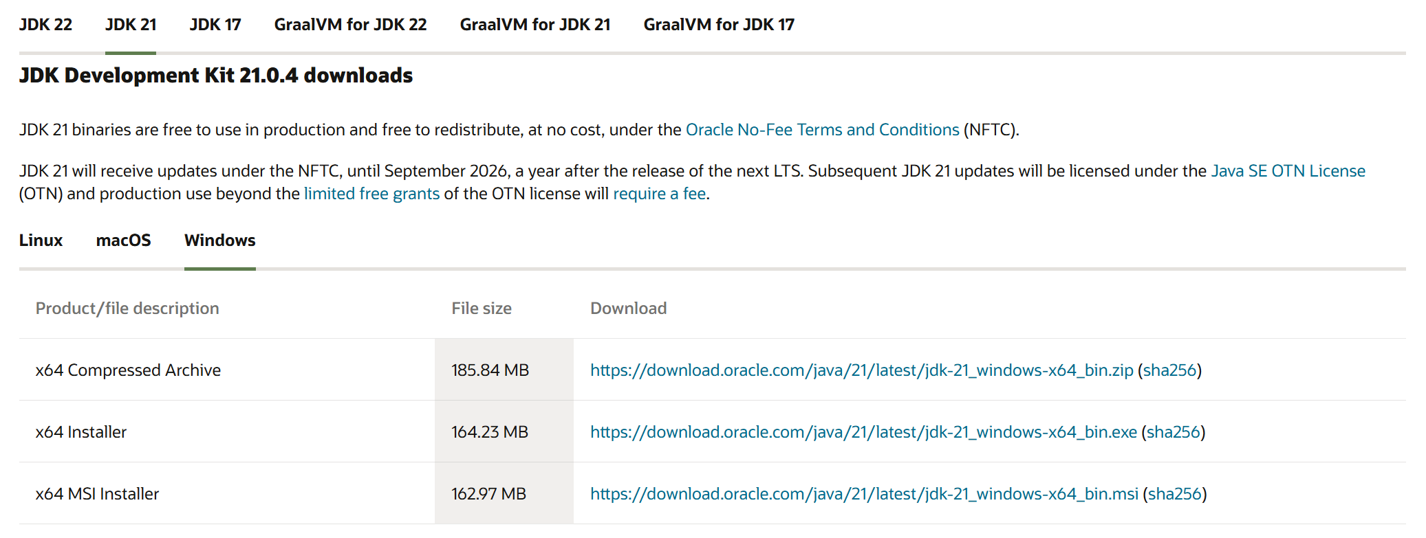 다음은 여러분이 사용하신 OS (Windows나, macOS, Linux)에 따라 해당 설치 프로그램을 다운로드 받습니다. 17버전 이상이면 사실 아무거나 설치해도 상관없긴 하지만, 여기서는 JDK21 Windows X64 Installer로 다운로드 받겠습니다.