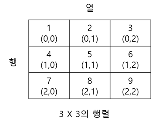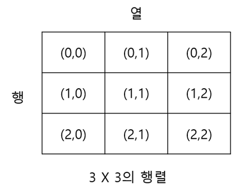 2차원 배열 변수의 [ ][ ] 안의 숫자는 행렬 좌표의 숫자와 같습니다. matrix[0][0]의 값은 행렬 (0,0)의 값과 같은 1입니다.