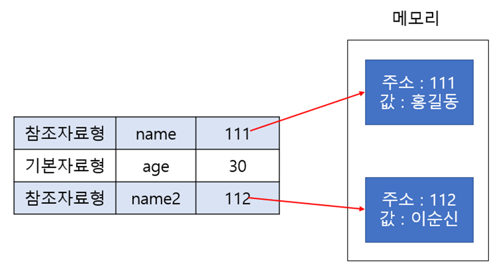 기본자료형 age 변수는 30이라는 리터럴값을 직접 저장하고 있지만 참조자료형 name과 name2 변수는 값을 직접 저장하고 있는것이 아니라 메모리 주소값만 저장하고 있습니다. name 변수에는 111이라는 주소값이, name2에는 112라는 주소값이 저장되어 있는 것이죠. 실제 값은 메모리에 저장하고 있고 변수는 메모리의 주소만 저장하고 있는 것입니다. 이름 그대로 참조만 하고 있는 형태입니다.
