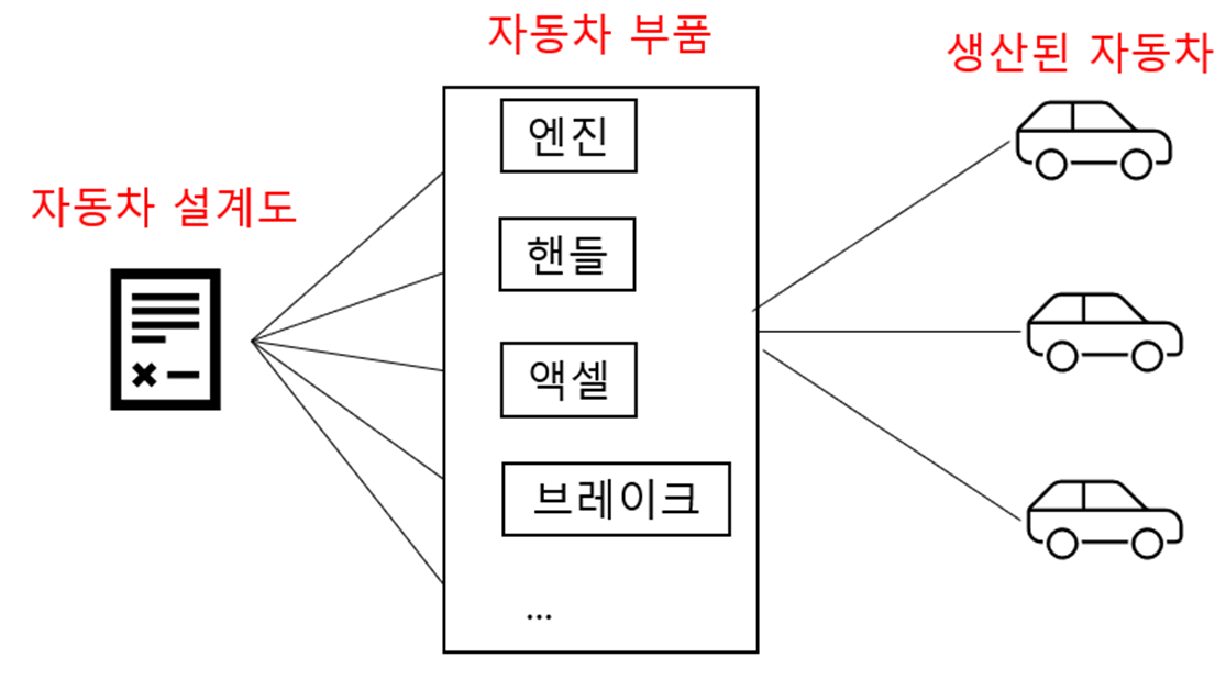 이번에 출시한 신차 이름가 “ABC” 라고 할때, 이 자동차를 내가 샀고, 내 친구가 샀다고 가정해보겠습니. “ABC” 자동차의 설계도로 만들어진 이 자동차는 모두 “ABC” 자동차겠죠? 하지만 내가 산 자동차와 내 친구가 산 자동차는 같은 자동차가 아닙니다. 같은 “ABC”라는 종류의 자동차일 뿐이지, 같은 자동차는 아니라는 것입니다. 즉 자동차의 종류(타입)는 ABC로 같지만 자동차의 이름은 내자동차, 친구자동차로 다른 자동차가가 됩니다.
