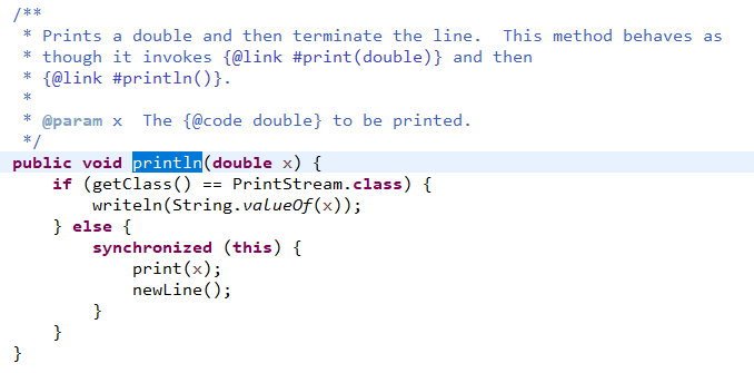 어떤 값을 넣어도 출력이 잘 되는 것을 알 수 있습니다. 객체는 알아볼 수 없는 형태로 출력되긴 했지만, 에러없이 출력이 됩니다. 그럼 이클립스에서 컨트롤키를 누른 상태에서 println() 메서드를 클릭해보세요.