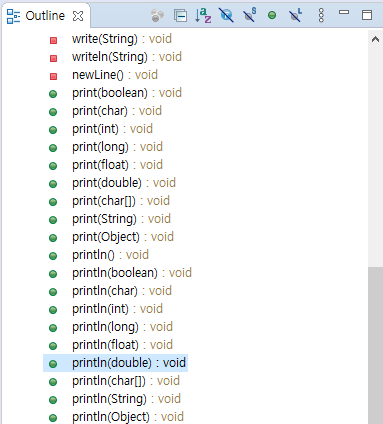새로운 탭으로 PrintStream class 클래스의 해당 println() 메서드로 이동될 것입니다. 소스를 살펴보면 예상대로 오버로딩된 메서드들이 있는 것을 알 수 있는데요, 이클립스 우측에 Outline을 보면 이 클래스의 전체 구조가 한눈에 보입니다.
