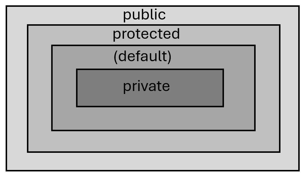 이 그림에서 보듯이 public이 가장 넓은 범위를 가지고 있고, 순서대로 public -> protected -> (default) -> private 순으로 좁아집니다.